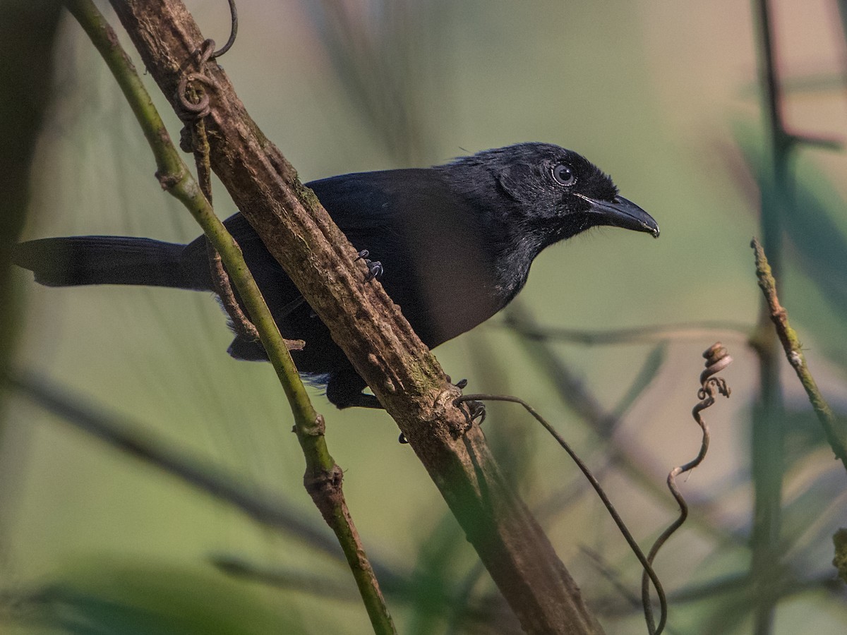The Mountain Sooty Boubou also known as the Western Boubou is a medium-sized bird known for its entirely black head and body. Its wings and tail are also black, and has a stout, hooked bill. This bird inhabits a variety of habitats including forests, woodlands and thickets.